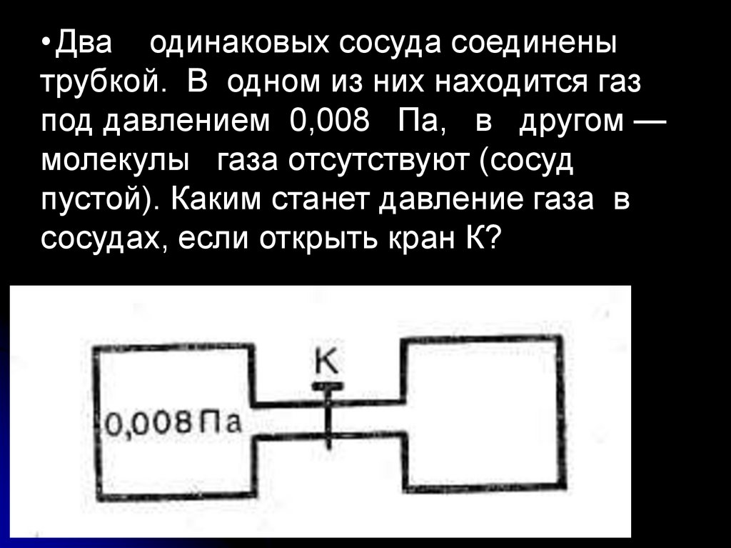 • Два одинаковых сосуда соединенытрубкой. В одном из них находится газ