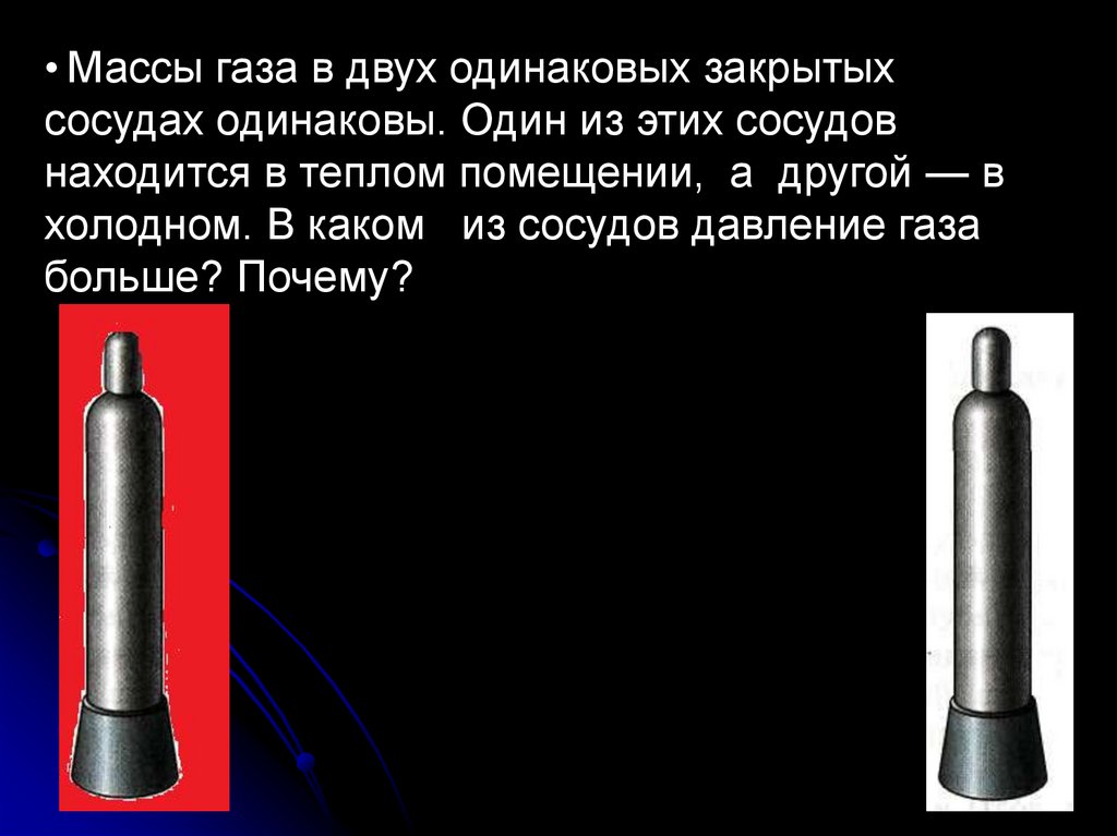 • Массы газа в двух одинаковых закрытыхсосудах одинаковы. Один из этих сосудов