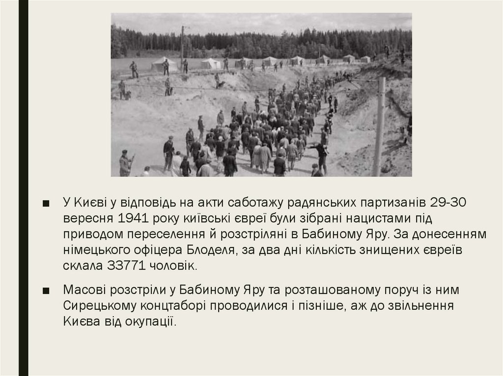 ■ У Києві у відповідь на акти саботажу радянських партизанів 29-30вересня 1941 року київські євреї були зібрані нацистами під