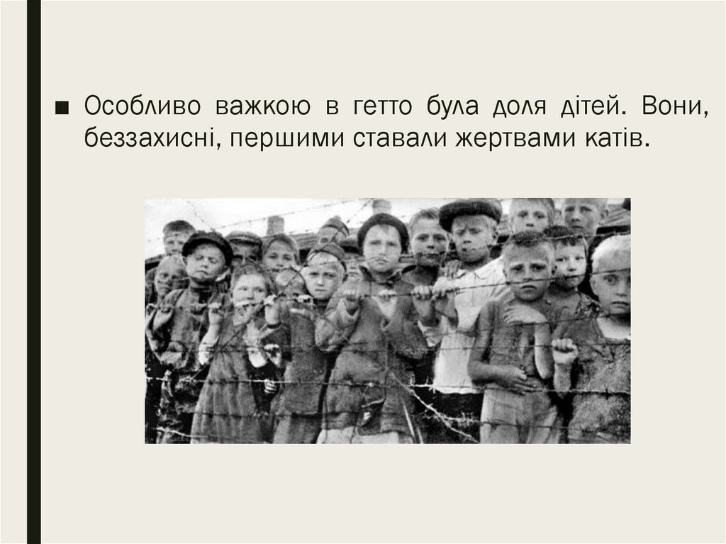 ■ Особливо важкою в гетто була доля дітей. Вони,беззахисні, першими ставали жертвами катів.