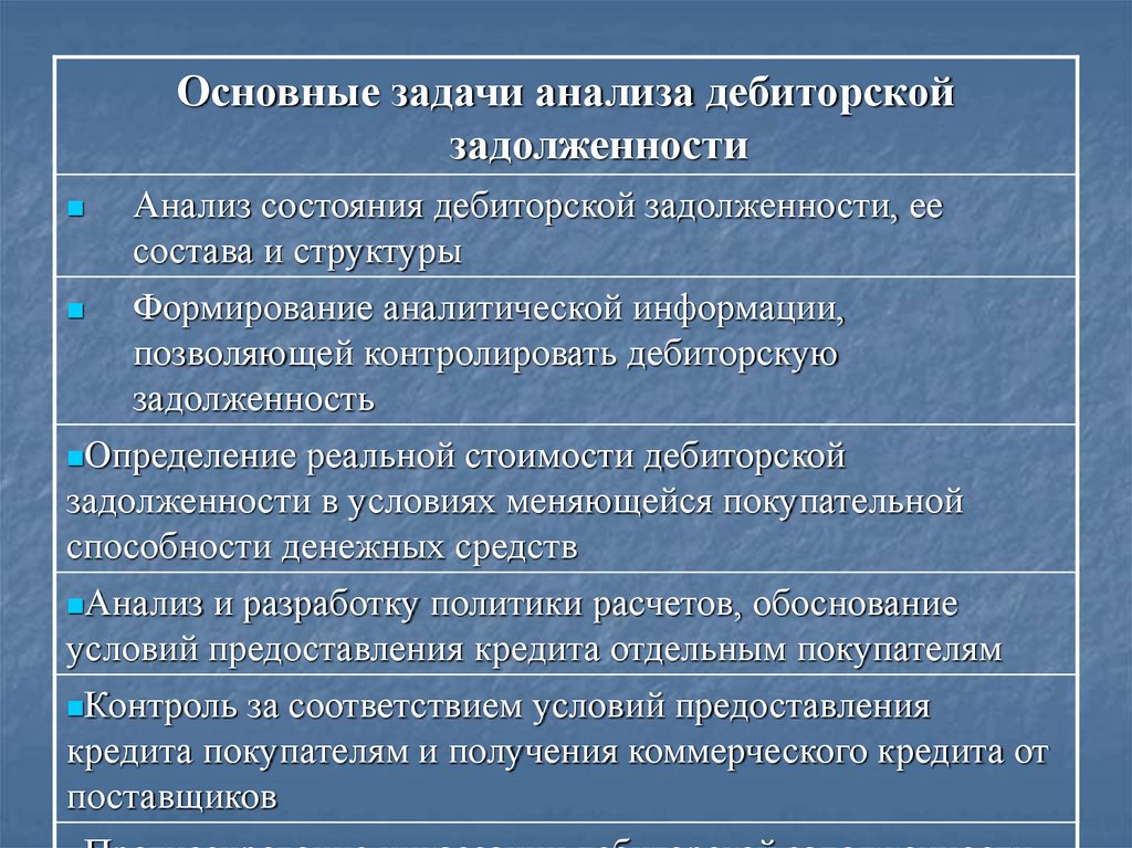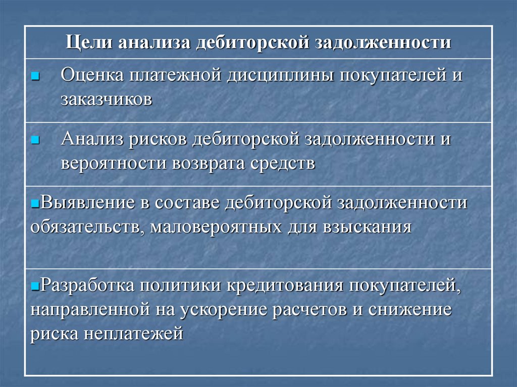 Цели анализа дебиторской задолженностиОценка платежной дисциплины покупателей и