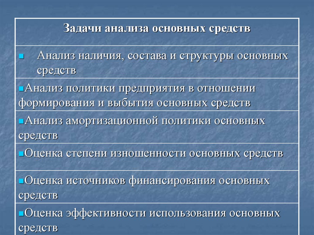 Задачи анализа основных средствАнализ наличия, состава и структуры основных