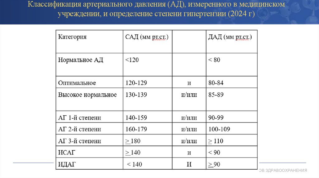 Классификация артериального давления (АД), измеренного в медицинскомучреждении, и определение степени гипертензии (2024 г)
