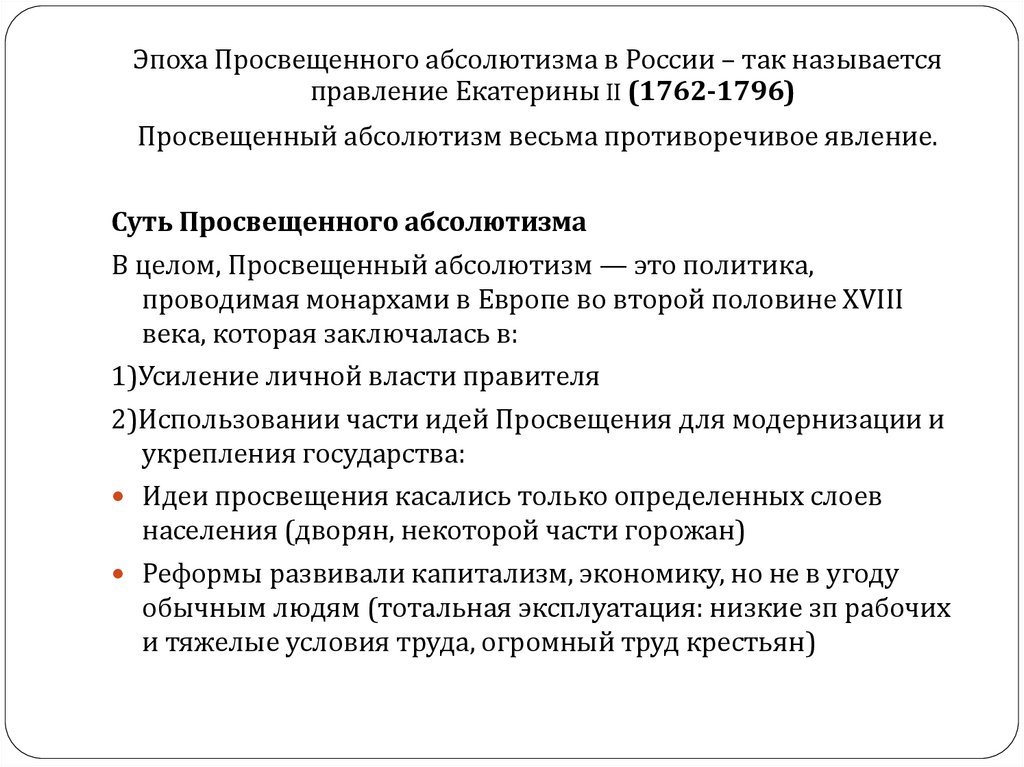 Эпоха Просвещенного абсолютизма в России – так называетсяправление Екатерины II (1762-1796)