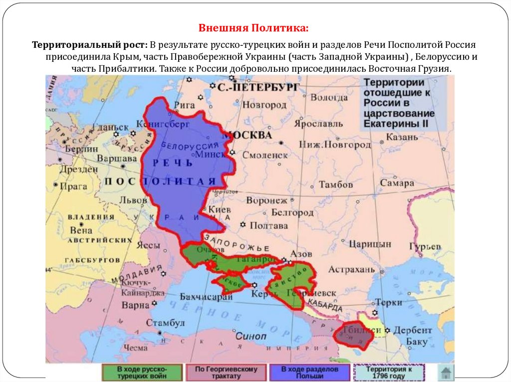 Внешняя Политика:Территориальный рост: В результате русско-турецких войн и разделов Речи Посполитой Россия