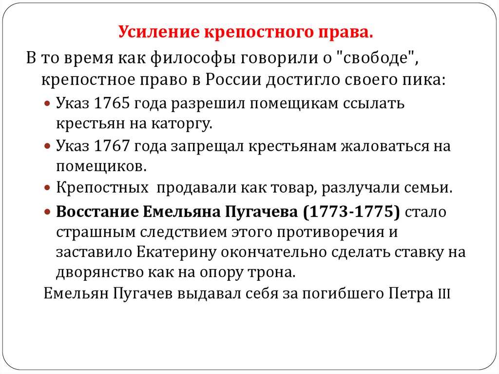 Усиление крепостного права.В то время как философы говорили о "свободе",