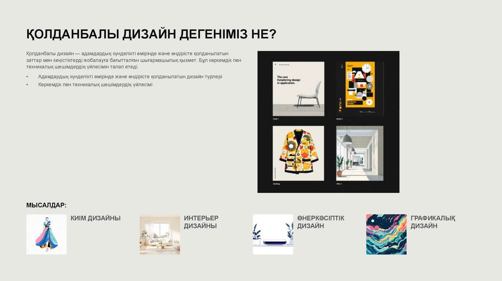 ҚОЛДАНБАЛЫ ДИЗАЙН ДЕГЕНІМІЗ НЕ?Қолданбалы дизайн — адамдардың күнделікті өмірінде және өндірісте қолданылатын