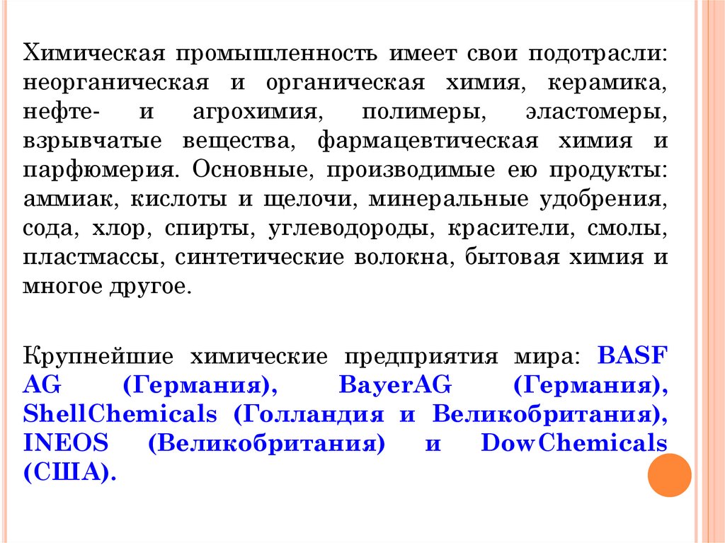 Химическая промышленность имеет свои подотрасли:неорганическая и органическая химия, керамика,