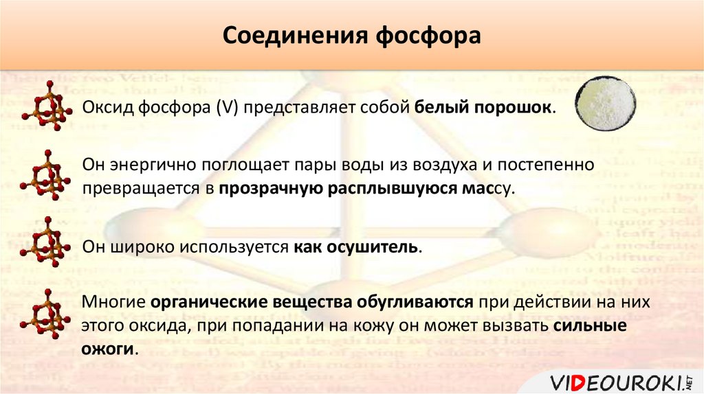 Соединения фосфораОксид фосфора (V) представляет собой белый порошок.