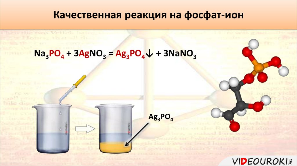Качественная реакция на фосфат-ионNa3PO4 + 3AgNO3 = Ag3PO4↓ + 3NaNO3
