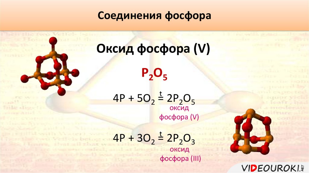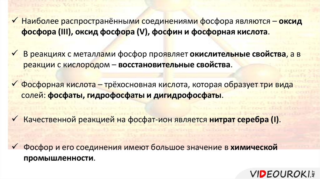 Наиболее распространёнными соединениями фосфора являются – оксидфосфора (III), оксид фосфора (V), фосфин и фосфорная кислота.