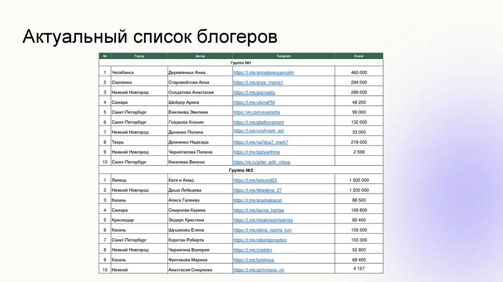 ● Кол-во блогеров из Санкт-Петербурга, Самары, Нижнего Новгорода, Казани,
