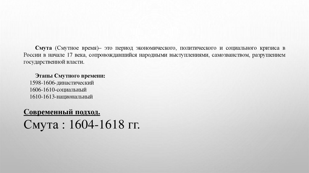 Смута (Смутное время)– это период экономического, политического и социального кризиса вРоссии в начале 17 века, сопровождавшийся народными выступлениями, самозванством, разрушением