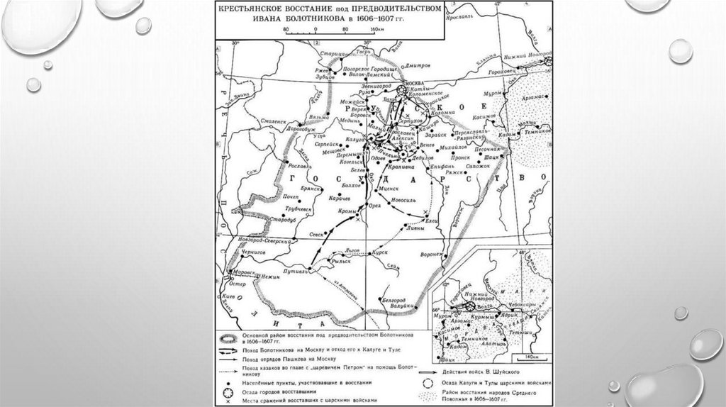 1606 – 1607 гг. – восстание Ивана Болотникова, осада Москвы. идут к Москве. Тушинский лагерь распадается, Лжедмитрий