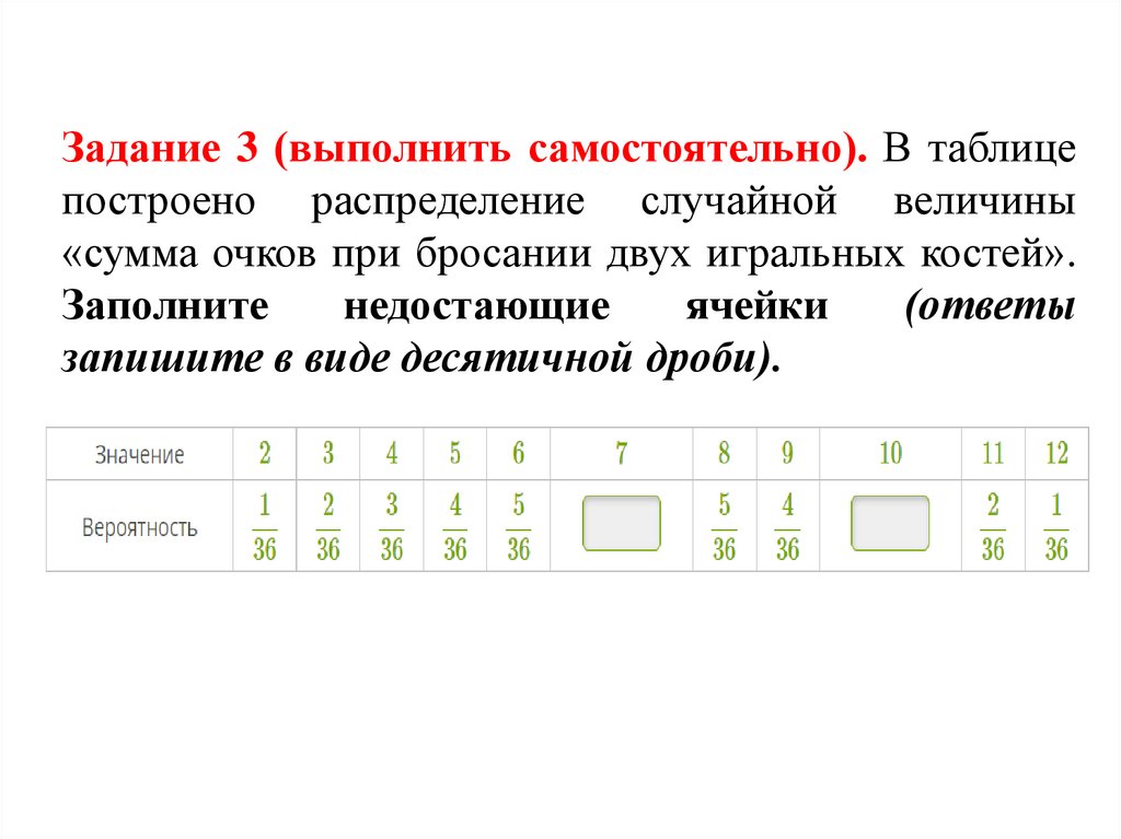 Задание 3 (выполнить самостоятельно). В таблицепостроено распределение случайной величины