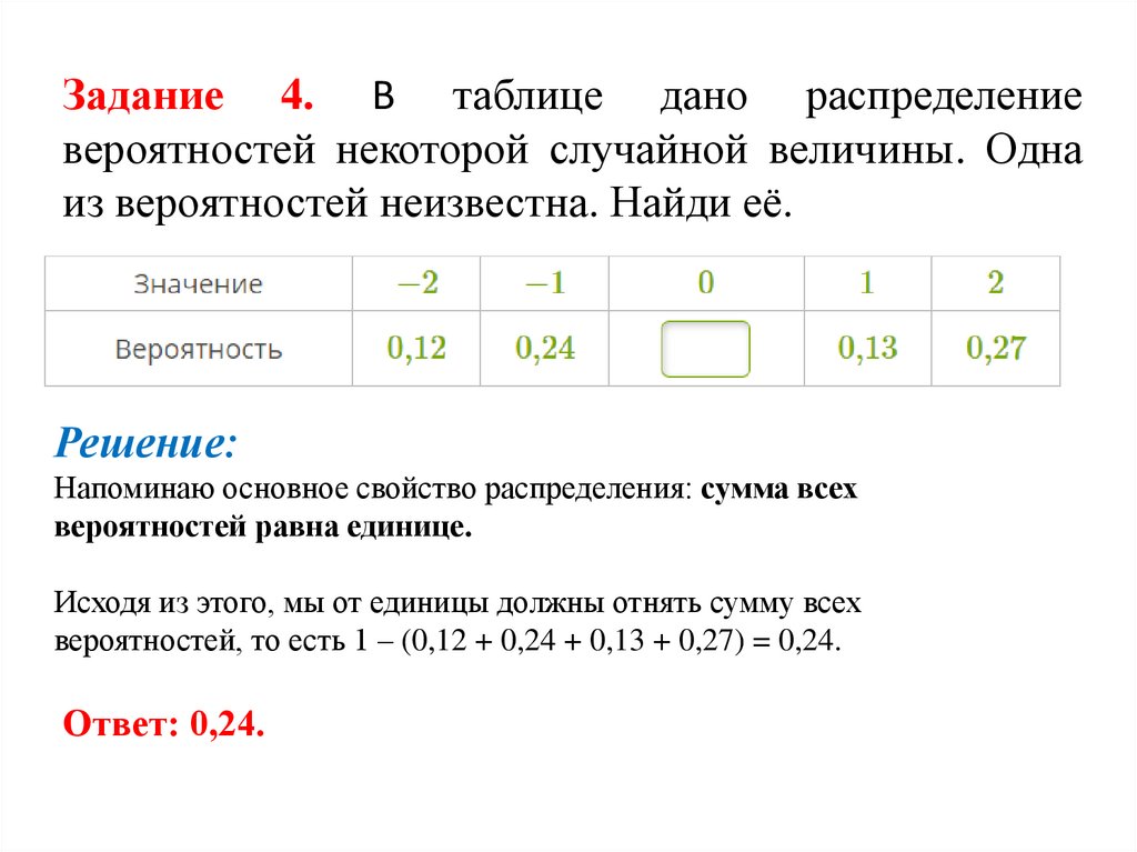 вероятностей, то есть 1 – (0,12 + 0,24 + 0,13 + 0,27) = 0,24.