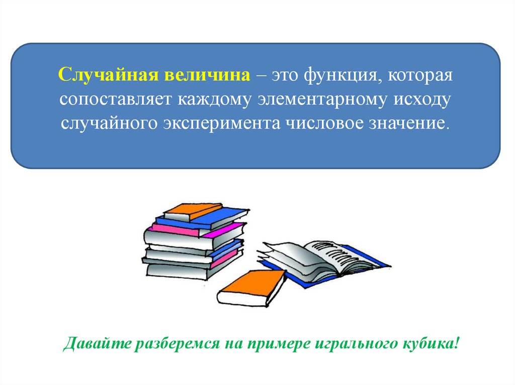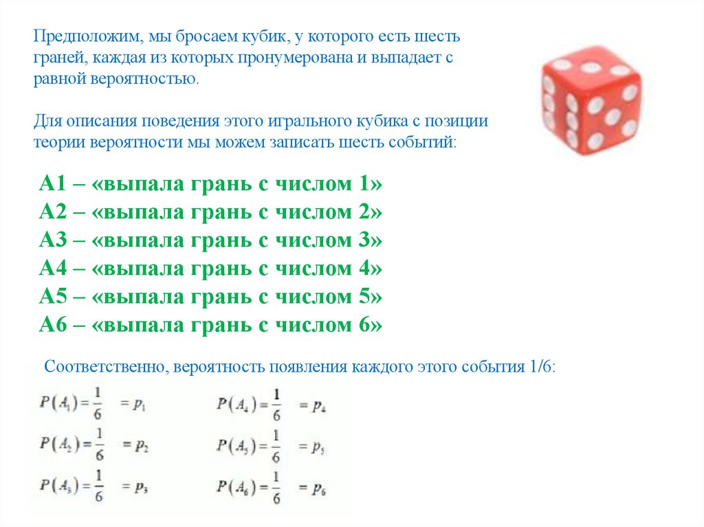 Предположим, мы бросаем кубик, у которого есть шестьграней, каждая из которых пронумерована и выпадает с