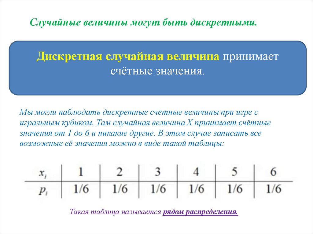 Случайные величины могут быть дискретными.Дискретная случайная величина принимает
