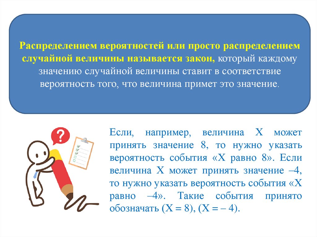 Распределением вероятностей или просто распределениемслучайной величины называется закон, который каждому