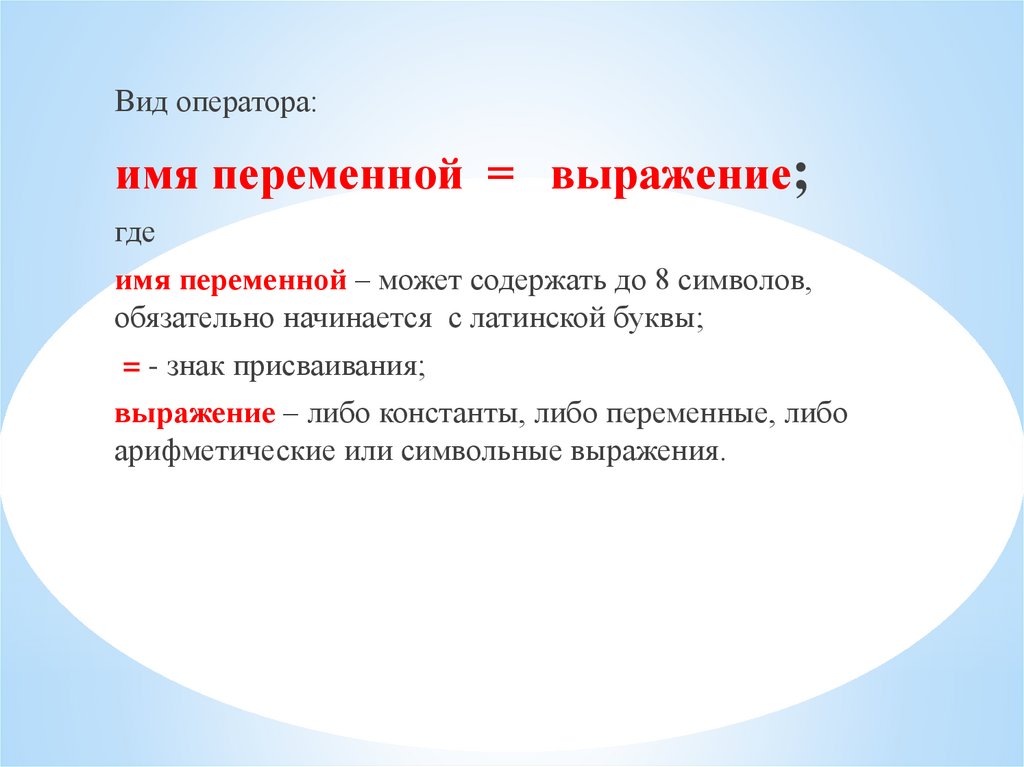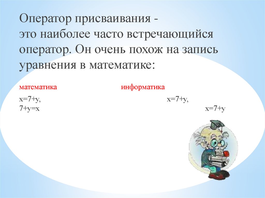 Оператор присваивания это наиболее часто встречающийсяоператор. Он очень похож на запись