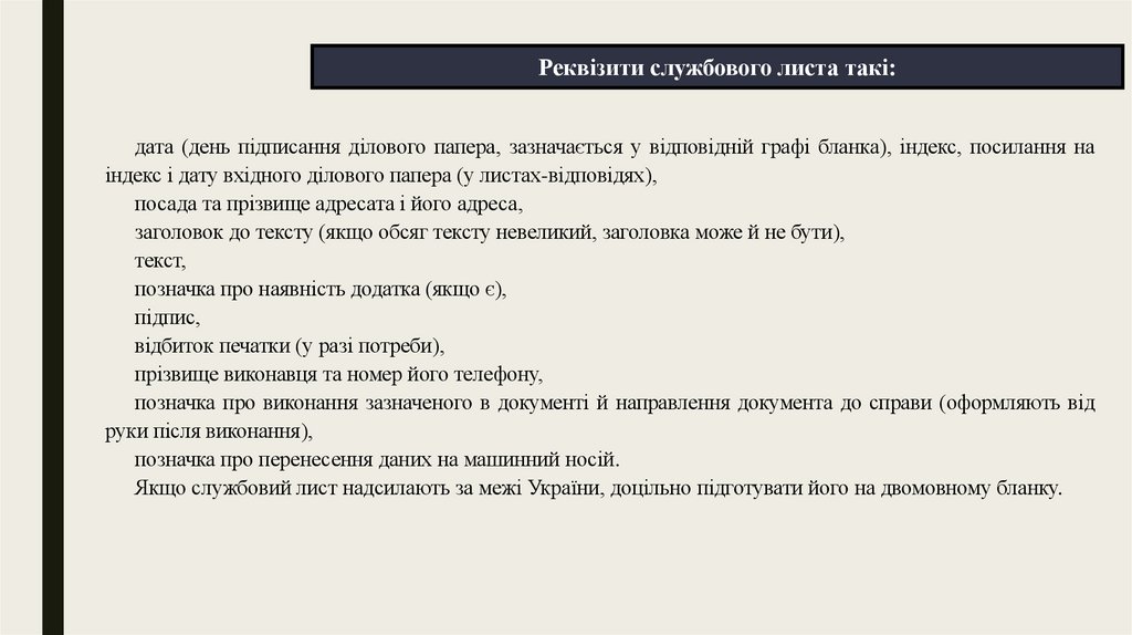 Реквізити службового листа такі:дата (день підписання ділового папера, зазначається у відповідній графі бланка), індекс, посилання на