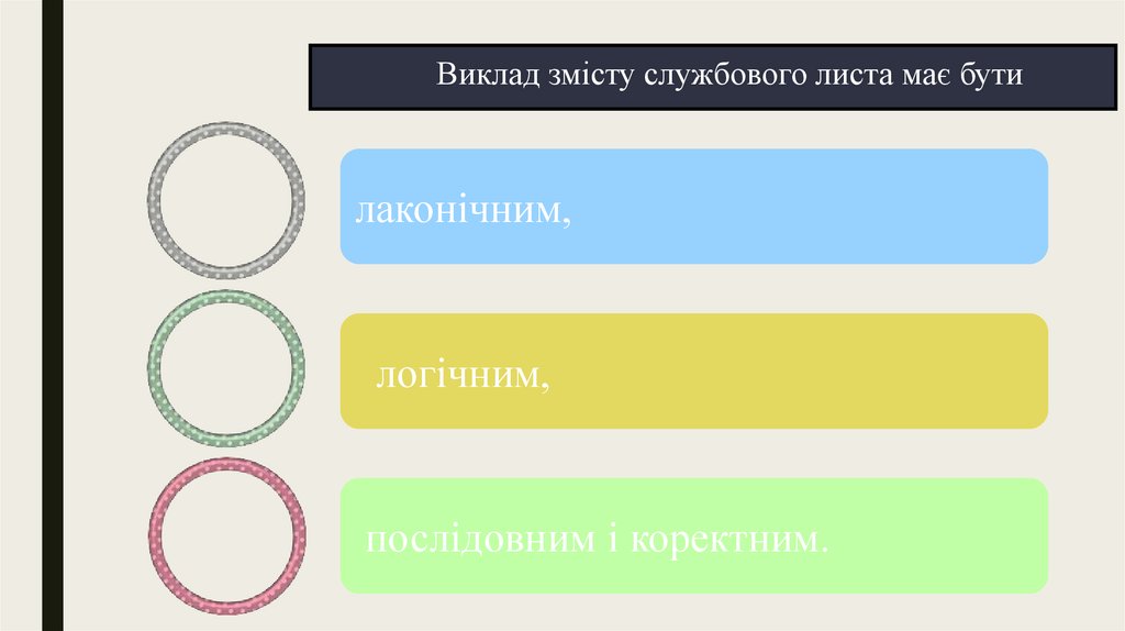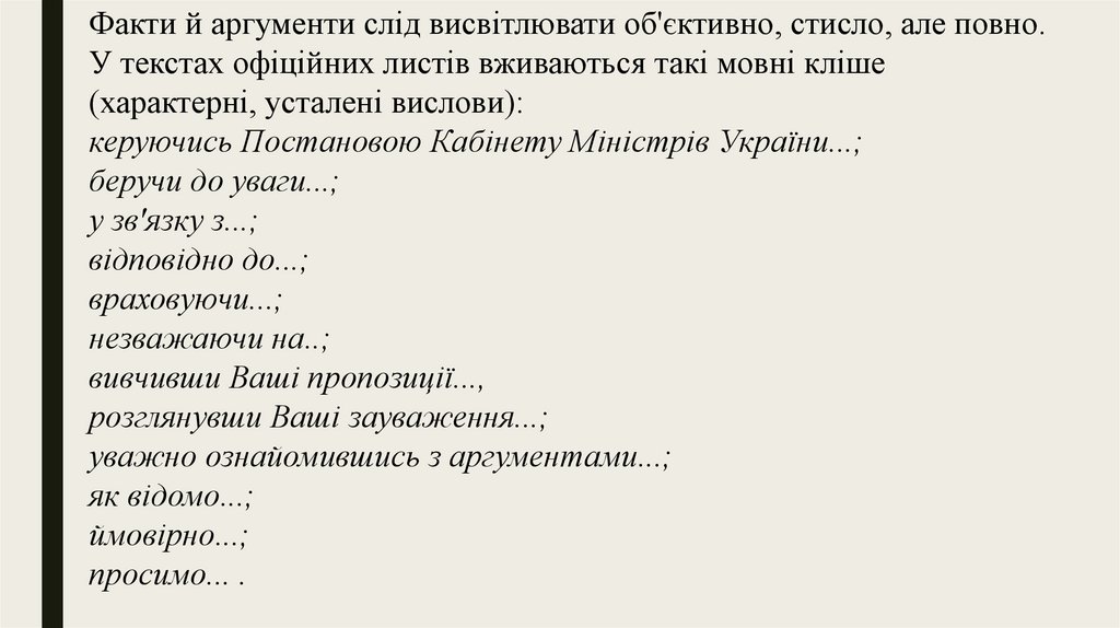Факти й аргументи слід висвітлювати об'єктивно, стисло, але повно.У текстах офіційних листів вживаються такі мовні кліше