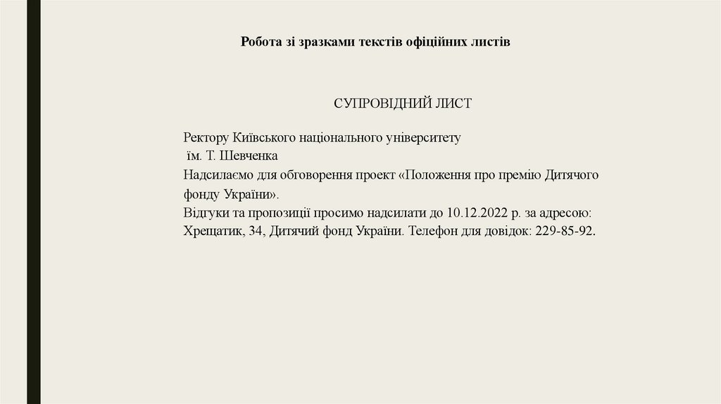 Робота зі зразками текстів офіційних листівСУПРОВІДНИЙ ЛИСТ