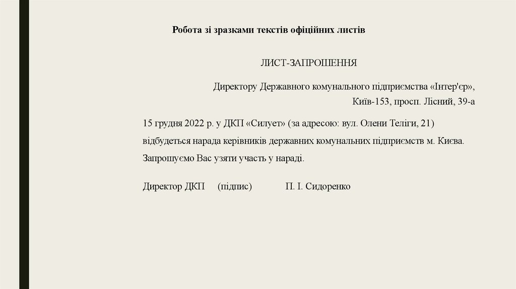 Робота зі зразками текстів офіційних листівЛИСТ-ЗАПРОШЕННЯ
