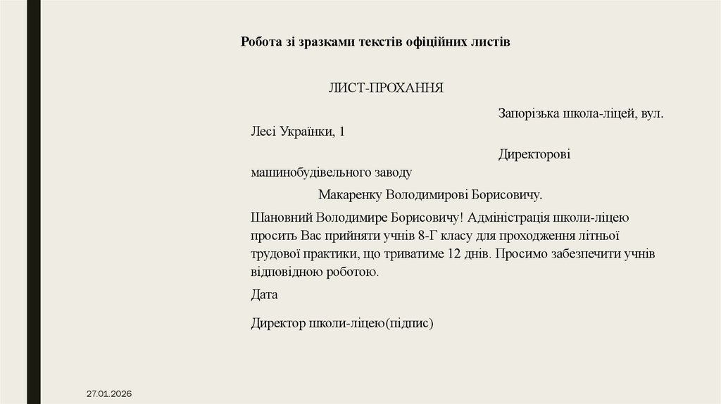 Робота зі зразками текстів офіційних листівЛИСТ-ПРОХАННЯ
