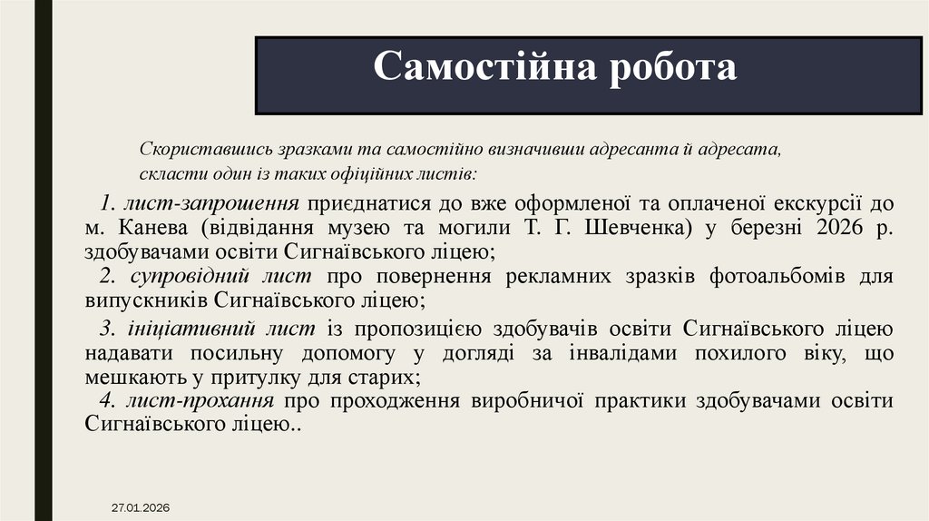Самостійна роботаСкориставшись зразками та самостійно визначивши адресанта й адресата,