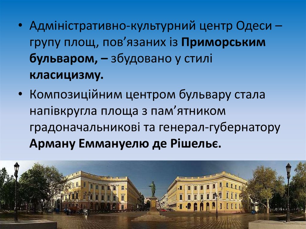 • Адміністративно-культурний центр Одеси –групу площ, пов’язаних із Приморським