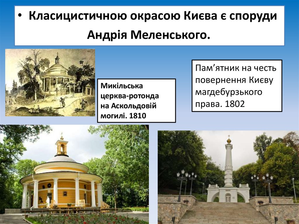 • Класицистичною окрасою Києва є спорудиАндрія Меленського.