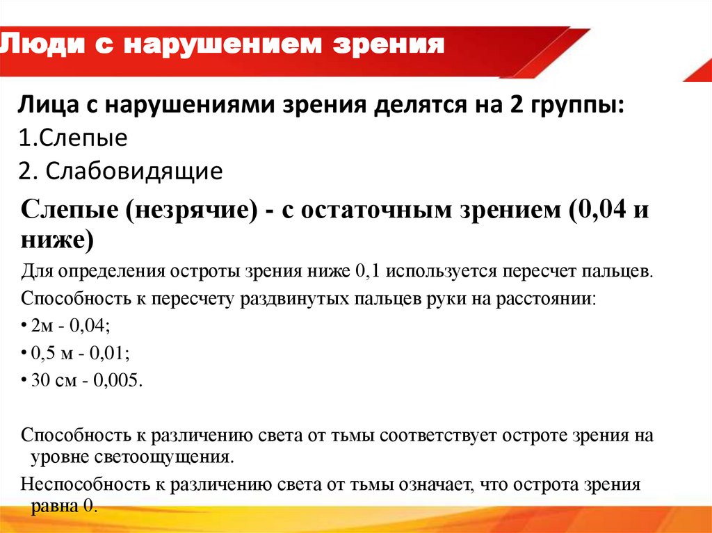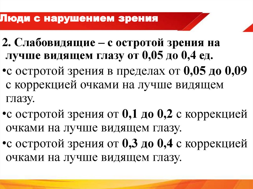 1. Люди с нарушением слуха2. Люди с нарушением зрения
