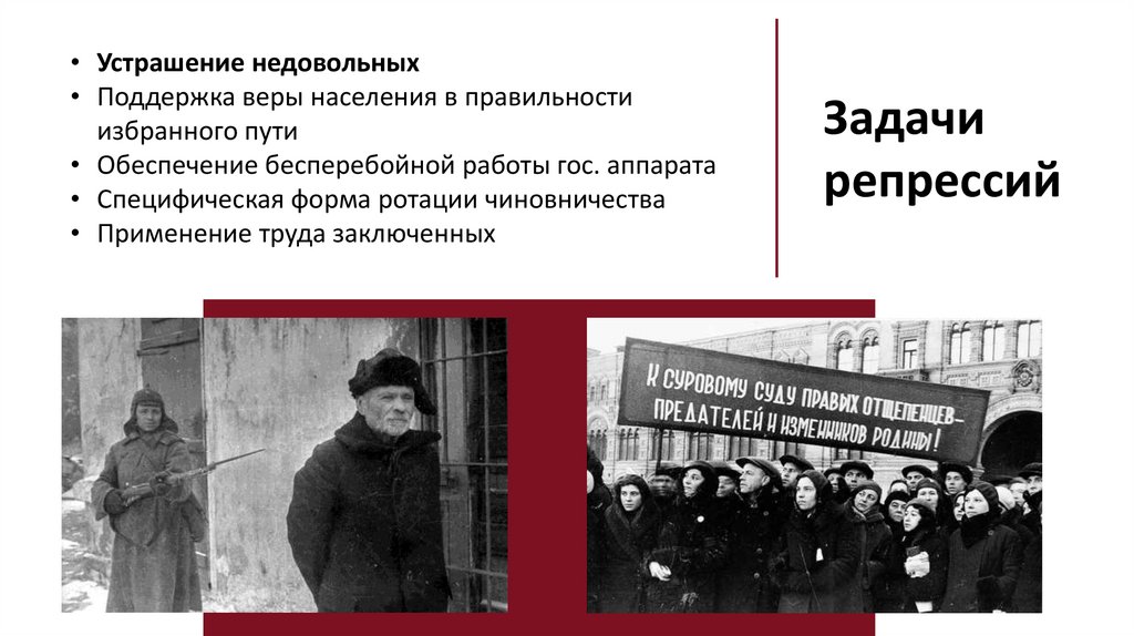 • Устрашение недовольных• Поддержка веры населения в правильности
