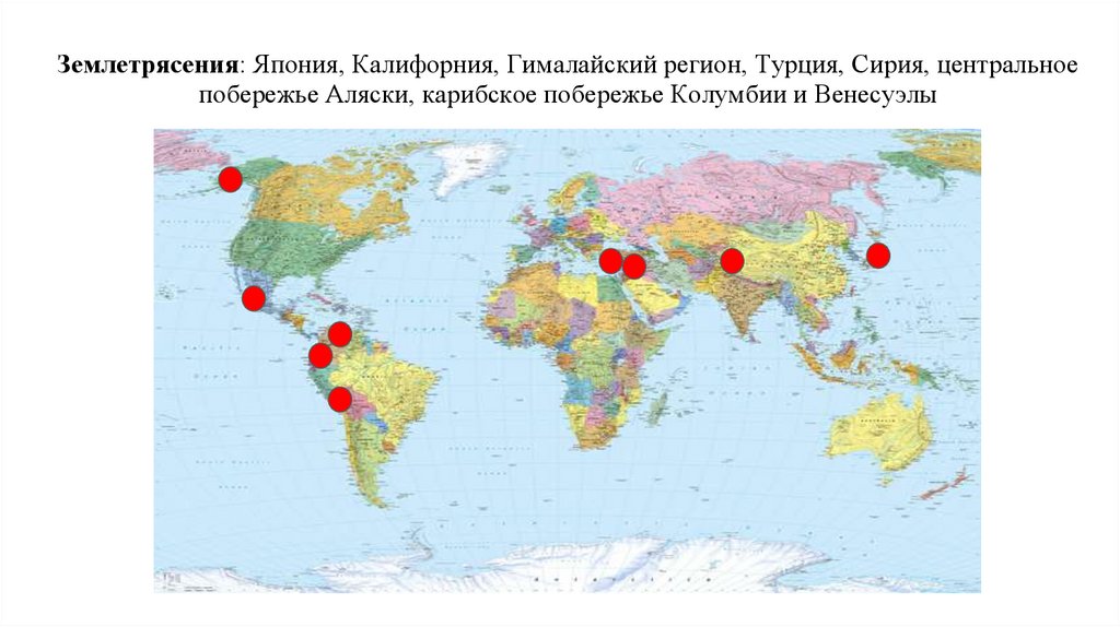 Землетрясения: Япония, Калифорния, Гималайский регион, Турция, Сирия, центральноепобережье Аляски, карибское побережье Колумбии и Венесуэлы