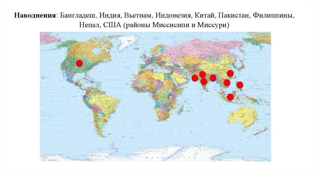 Наводнения: Бангладеш, Индия, Вьетнам, Индонезия, Китай, Пакистан, Филиппины,Непал, США (районы Миссисипи и Миссури)