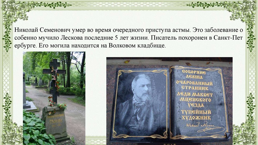 Николай Семенович умер во время очередного приступа астмы. Это заболевание особенно мучило Лескова последние 5 лет жизни. Писатель похоронен в Санкт-Пет