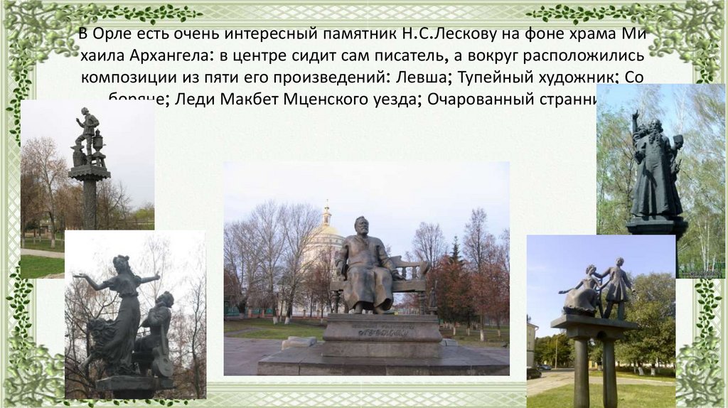 В Орле есть очень интересный памятник Н.С.Лескову на фоне храма Михаила Архангела: в центре сидит сам писатель, а вокруг расположились