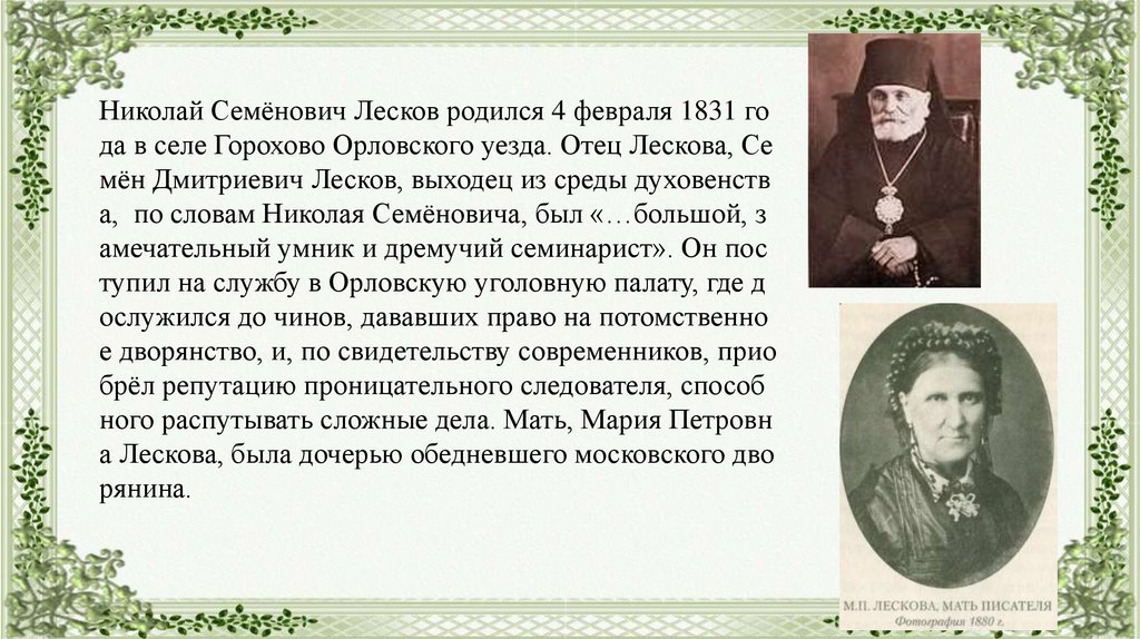 Николай Семёнович Лесков родился 4 февраля 1831 года в селе Горохово Орловского уезда. Отец Лескова, Се