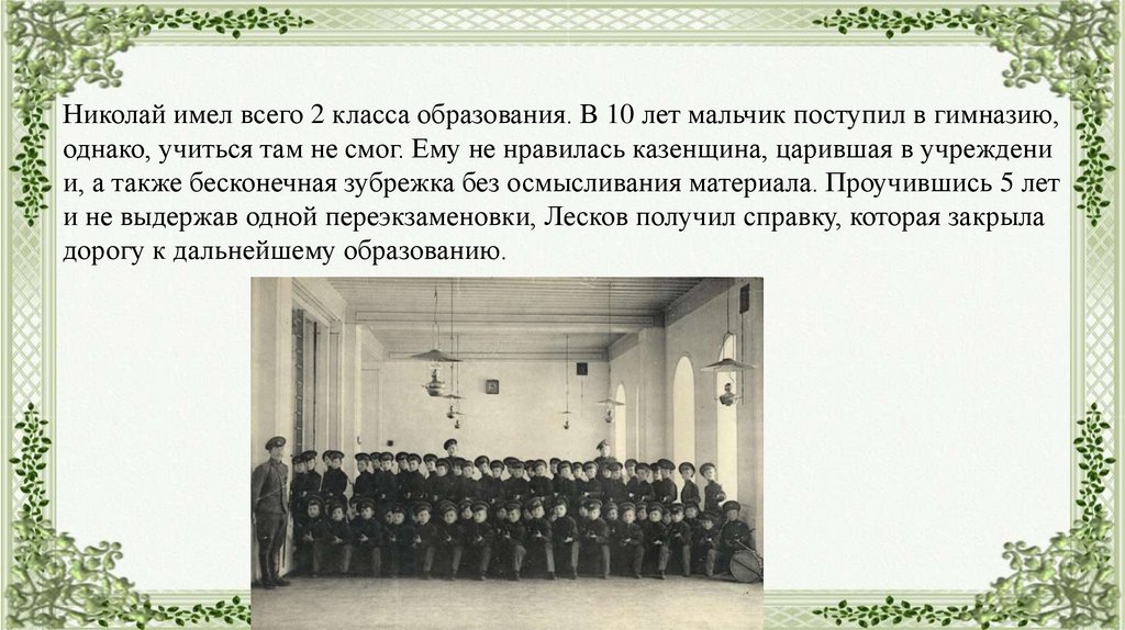 и не выдержав одной переэкзаменовки, Лесков получил справку, которая закрыла