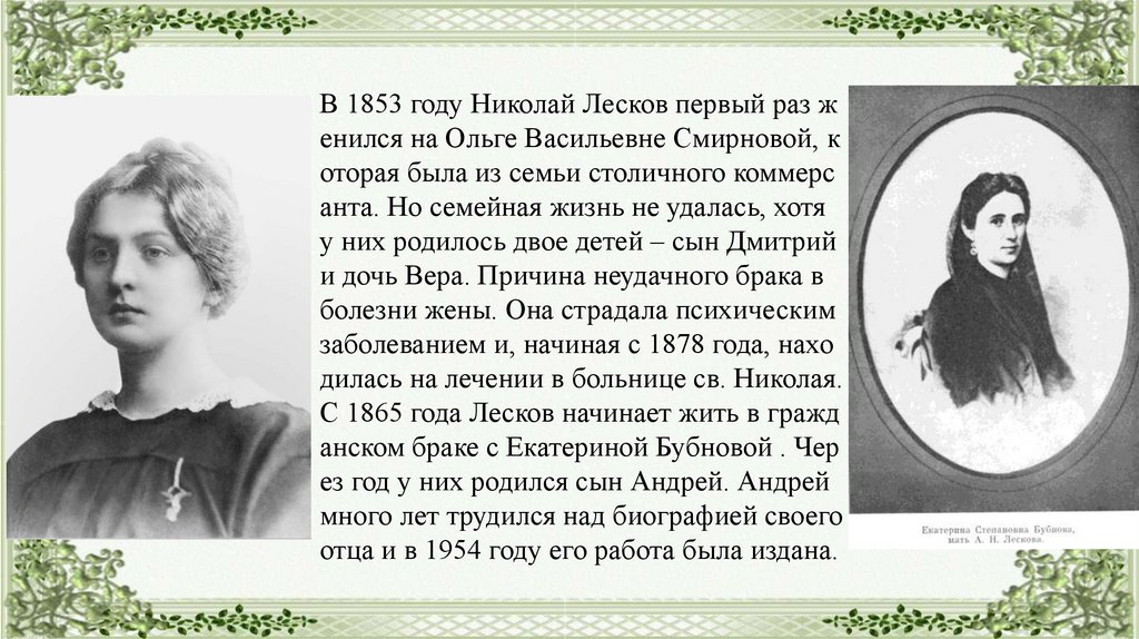 В 1853 году Николай Лесков первый раз женился на Ольге Васильевне Смирновой, к