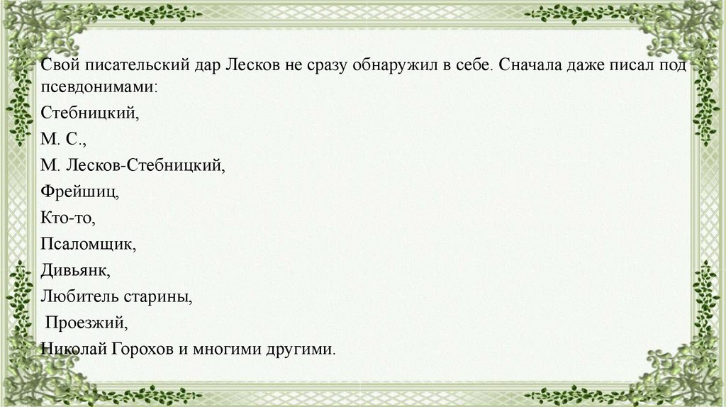 Свой писательский дар Лесков не сразу обнаружил в себе. Сначала даже писал подпсевдонимами: