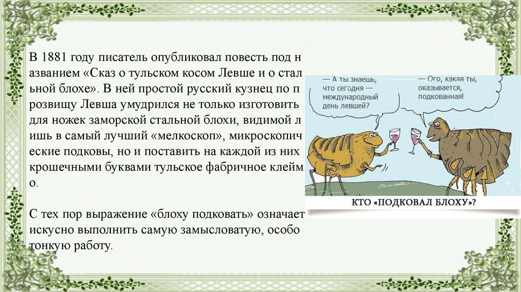 В 1881 году писатель опубликовал повесть под названием «Сказ о тульском косом Левше и о стал
