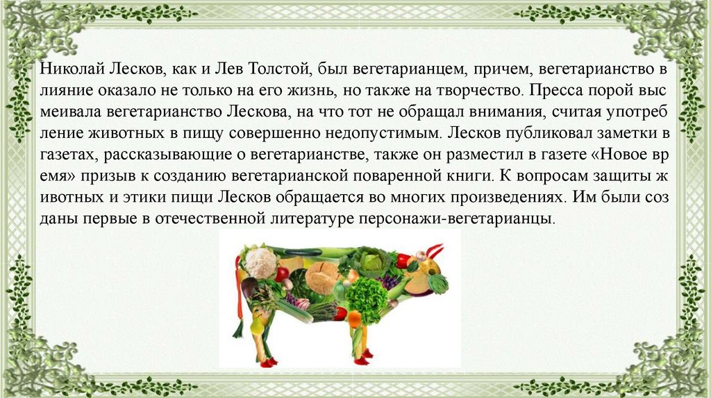 Николай Лесков, как и Лев Толстой, был вегетарианцем, причем, вегетарианство влияние оказало не только на его жизнь, но также на творчество. Пресса порой выс
