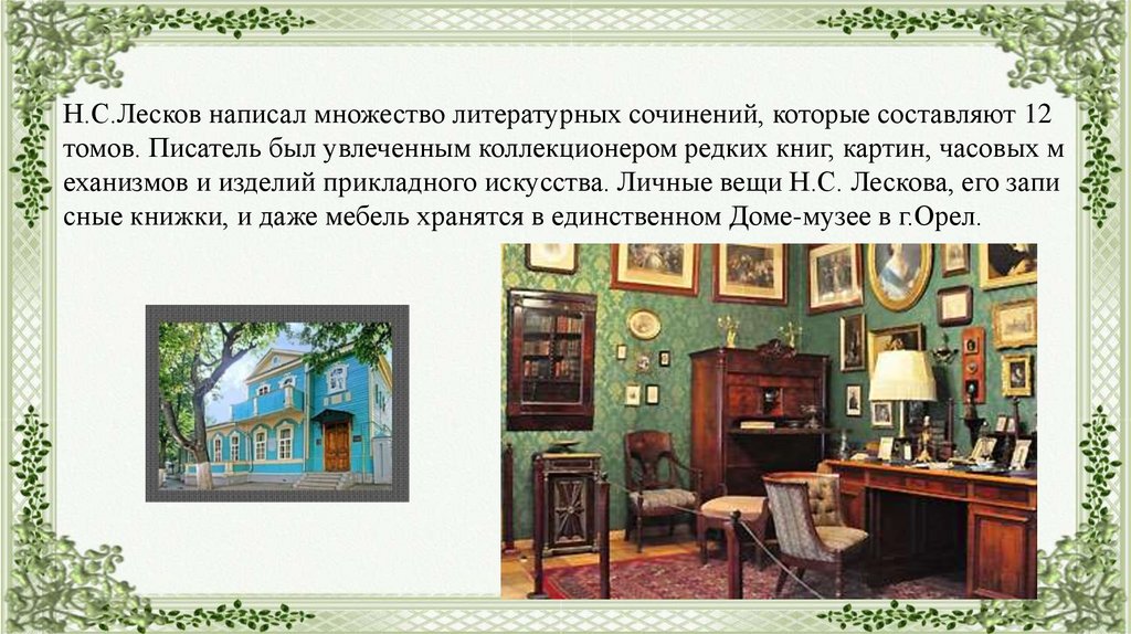 Н.С.Лесков написал множество литературных сочинений, которые составляют 12томов. Писатель был увлеченным коллекционером редких книг, картин, часовых м