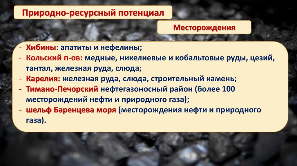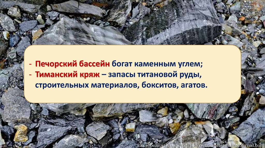 - Печорский бассейн богат каменным углем;- Тиманский кряж – запасы титановой руды,