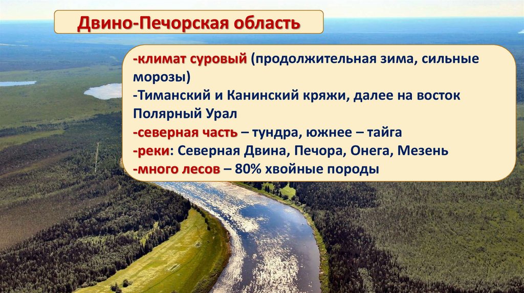Двино-Печорская область-климат суровый (продолжительная зима, сильные