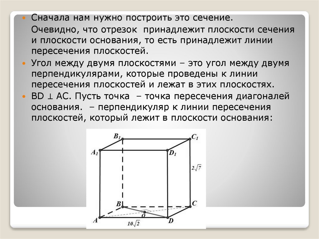 Сначала нам нужно построить это сечение.Очевидно, что отрезок принадлежит плоскости сечения