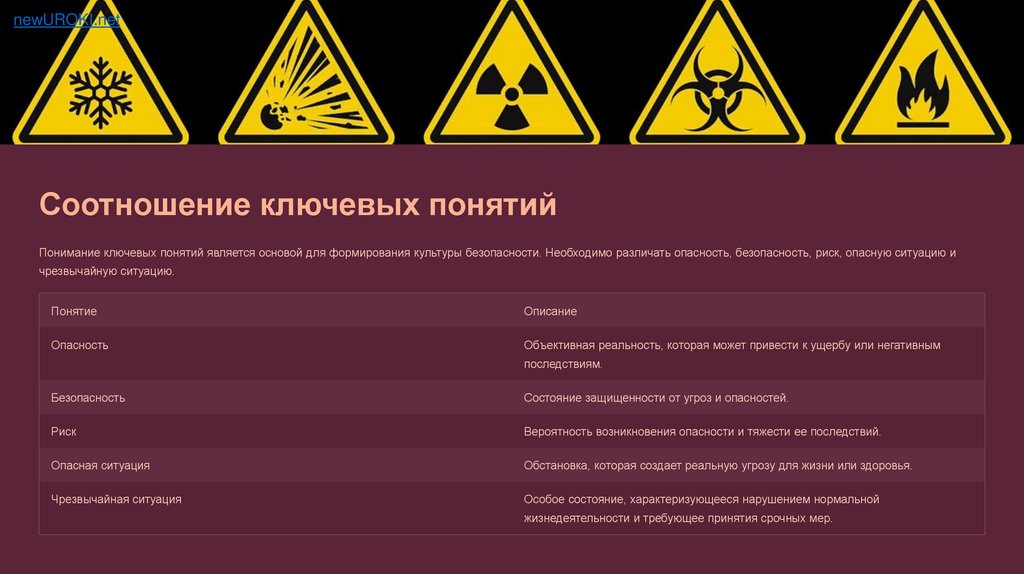 Понимание ключевых понятий является основой для формирования культуры безопасности. Необходимо различать опасность, безопасность, риск, опасную ситуацию и
