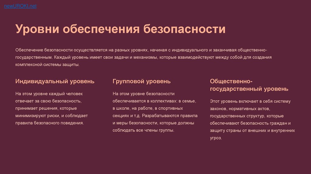 Обеспечение безопасности осуществляется на разных уровнях, начиная с индивидуального и заканчивая общественногосударственным. Каждый уровень имеет свои задачи и механизмы, которые взаимодействуют между собой для создания